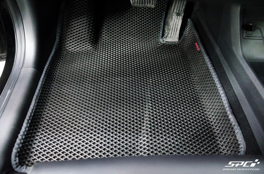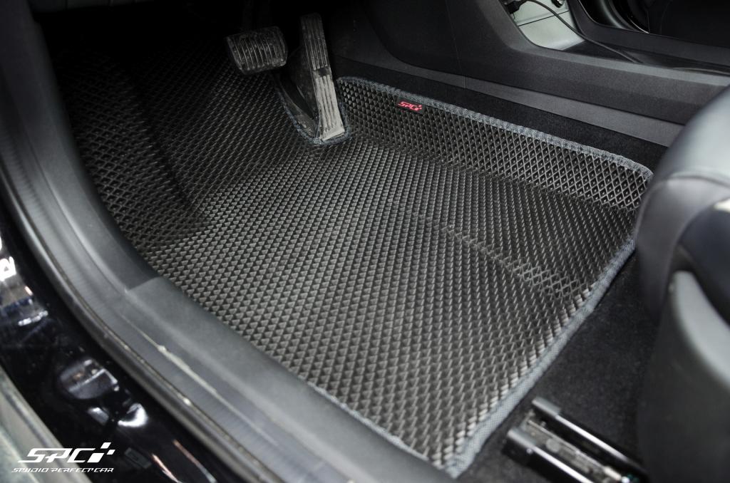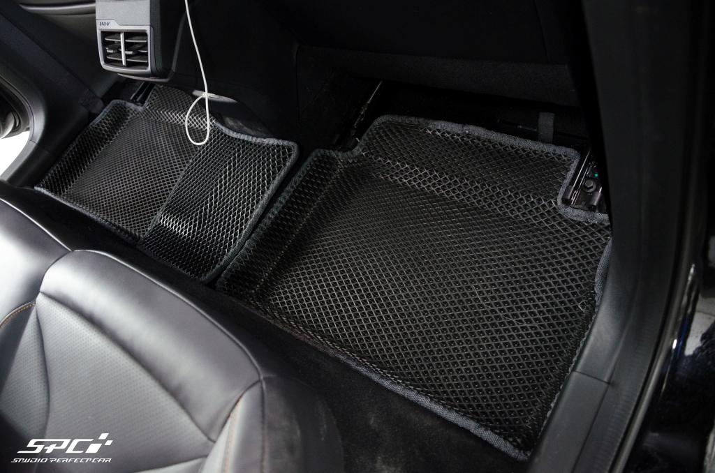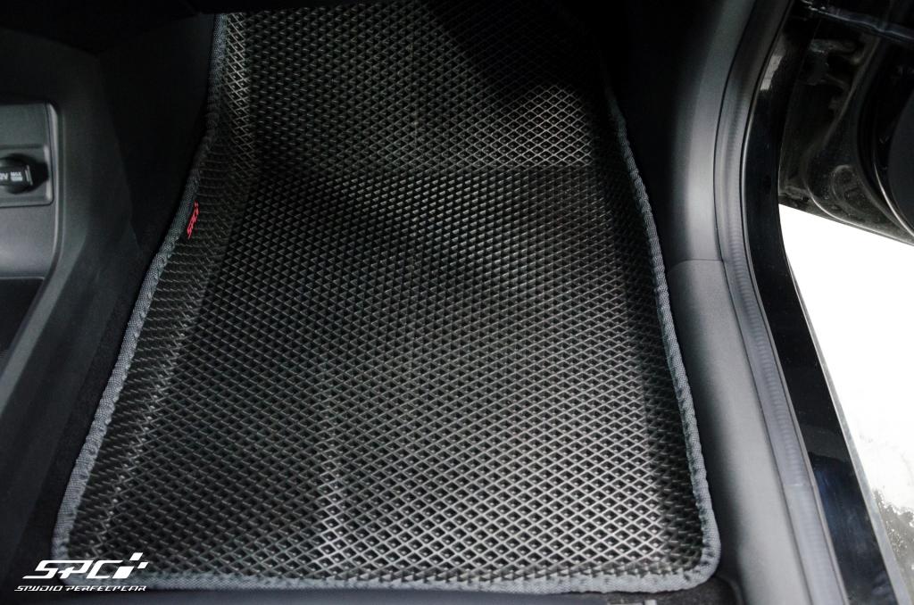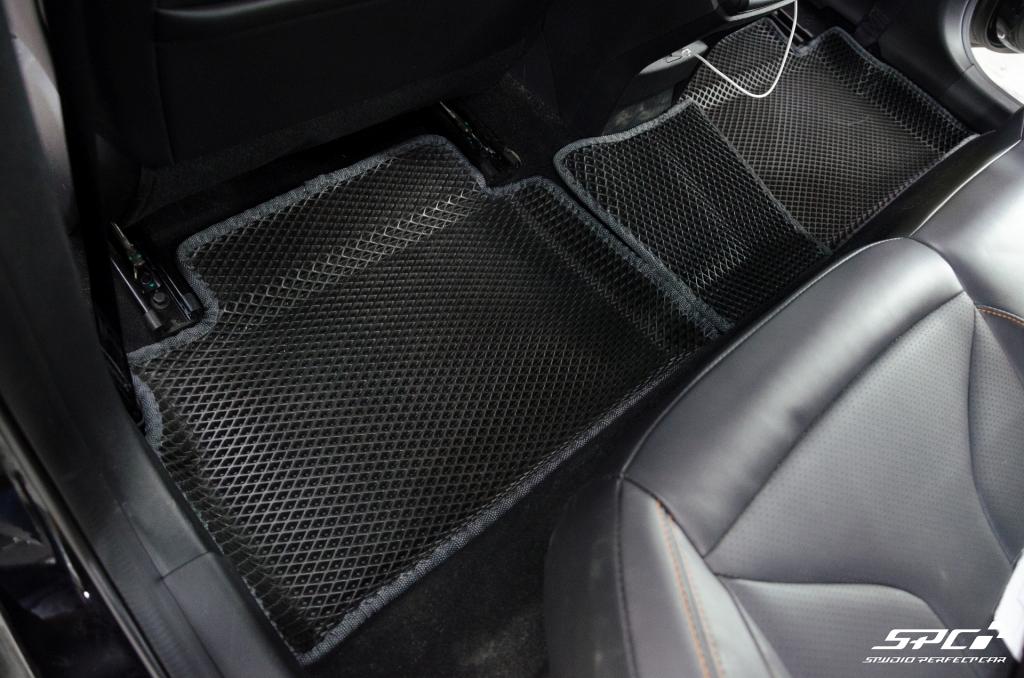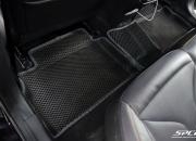 Коврики изготовлены из EVA-материала российского производства с ячейками на выбор: соты или ромбы. Эта линейка ковров изготавливается по формам, которые полностью повторяет рельеф пола Вашей марки и модели автомобиля на специальных станках. В комплект в салон входит 5 ковриков: 2 передних, 2 задних и перемычка. Водительский коврик изготавливаем без разреза под ступеньку для отдыха левой ноги, формуем. Для надежной фиксации в салоне с изнаночной стороны коврики отшиваем липучками.
